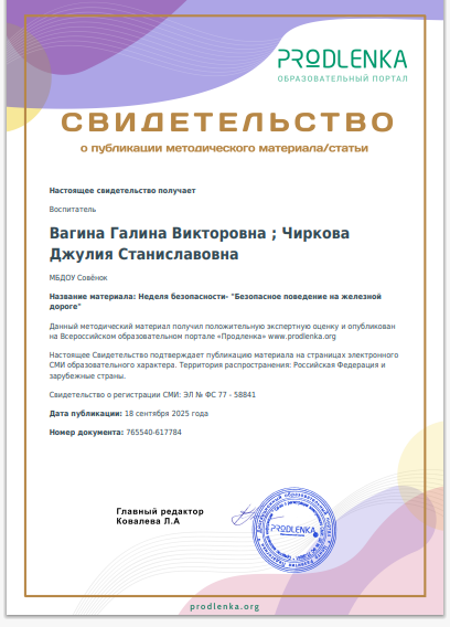Свидетельство о публикации "Безопасное поведение на ж/д путях"