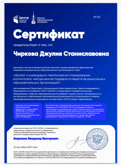 Сертификат онлайн-вебинар "Диалог о календарно-тематическом планировании"